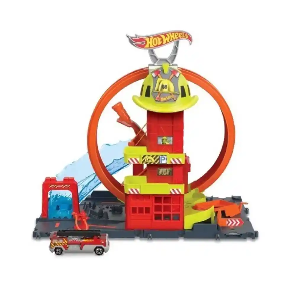 America Store te trae La Pista De Hot Wheels City Juguete Súper Estación De Bomberos El set de juego Estación de bomberos superloop de City de Hot Wheels® celebra una ubicación favorita de los niños con un loop ajustable de varios niveles que impulsa los vehículos a través de la estación y por una rampa transparente, como de agua. La base cuenta con emocionantes detalles de juego de pistas que inspiran historias creativas y conectores para combinarla con otros sets de Hot Wheels®. Se venden por separado y están sujetos a disponibilidad. Se incluye un camión de bomberos Hot Wheels®. Los colores y las decoraciones pueden variar. Fabricante: Mattel Importador: Mattel Colombia Recomendaciones: Requiere de la supervisión directa de un adulto, puede contener partes pequeñas, riesgo de asfixia o ahogamiento, no destinar este juguete para menores por debajo de la edad establecida en la etiqueta. Edad mínima sugerida: 4 años Lote: Dato variable. Se puede verificar en el sticker que trae el producto físico. Fecha de fabricación: Dato variable. Se puede verificar en el sticker que trae el producto físico.