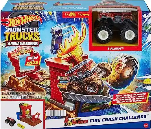 Catapulta HW 5-Alarm™ a través de llamas imaginarias para llegar al lugar de la explosión y apagar el fuego en el set de juego Hot Wheels Monster Trucks Arena Smashers™ 5-Alarm Fire Crash Challenge™. La base que se mueve y se sacude crea retroalimentación sensorial para un juego realmente atractivo: ¡los niños pueden sentir el poder de estrellarse y aplastarse en las palmas de sus manos! Se incluye un HW 5-Alarm™ a escala 1:64 junto con un automóvil aplastable que se puede colocar en las gradas para una destrucción más épica. Este set se conecta con otros sets de Hot Wheels Monster Trucks Arena Smashers™ para un estadio repleto de monstruosos obstáculos. Cada juego se vende por separado, sujeto a disponibilidad. Es un gran regalo para niños de 4 años en adelante. Los colores y decoraciones pueden variar. En Hot Wheels Monster Trucks Arena Smashers™ 5-Alarm Crash Challenge™, los niños lanzan HW 5-Alarm™ en un punto especial para apagar las llamas y conquistar el desafío. La base del set se mueve y tiembla, creando retroalimentación sensorial durante el retraso del crecimiento y el choque. Los niños pueden llenar las tribunas con autos aplastables u otros autos Hot Wheels® que pueden ser lanzados al aire sin sospechar nada cuando el HW 5-Alarm™ atraviesa las llamas. Se incluye un automóvil aplastable; los automóviles adicionales se venden por separado. Conecta el 5-Alarm Fire Crash Challenge™ con otros conjuntos de Hot Wheels Monster Trucks Arena Smashers™ para construir un mundo de Hot Wheels Monster Trucks Arena Smashers™ repleto de diferentes desafíos y obstáculos. (Los juegos adicionales se venden por separado). Es un gran regalo para niños de 4 años en adelante a quienes les encanta la acción aplastante y chocante de los Monster Trucks Hot Wheels®.
