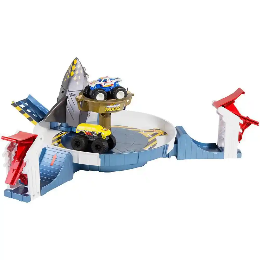 El set de juego Mecha Shark Face-Off ™ es una batalla de Monster Truck cara a cara de alto riesgo. donde los ganadores obtienen el trofeo y todos los demás son devorados por el tiburón. Los dos Monster Trucks Hot Wheels® a escala 1:64 con sus gigantescas ruedas gigantes se enfrentan entre sí y un tiburón mecánico amenazador. Un camión es un Hot Wheels® Racing Truck fundido a troquel y el otro es un vehículo de prueba de choque separado Crash Recruit ™ exclusivo de este conjunto. Los niños ponen a prueba sus habilidades de sincronización en una arena circular con un gran trofeo en el centro. ¡Comience la acción y coloque camiones en lanzadores opuestos para chocar entre sí en el modo de dos jugadores! ¡Aterriza dentro del trofeo para ganar o perder y convertirte en carnada de tiburón!