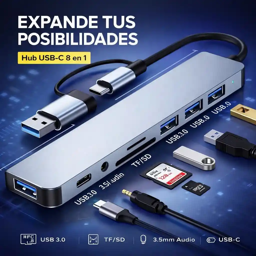 Convierte un solo puerto en múltiples conexiones con este Hub Adaptador USB C 8 en 1. Conecta fácilmente memorias USB, teclado, mouse, tarjetas SD y más desde tu laptop, PC o dispositivos compatibles. Ideal para ampliar la conectividad de computadores, tablets y algunos celulares compatibles con USB-C. Perfecto para trabajo, estudio, presentaciones o transferir archivos rápidamente.