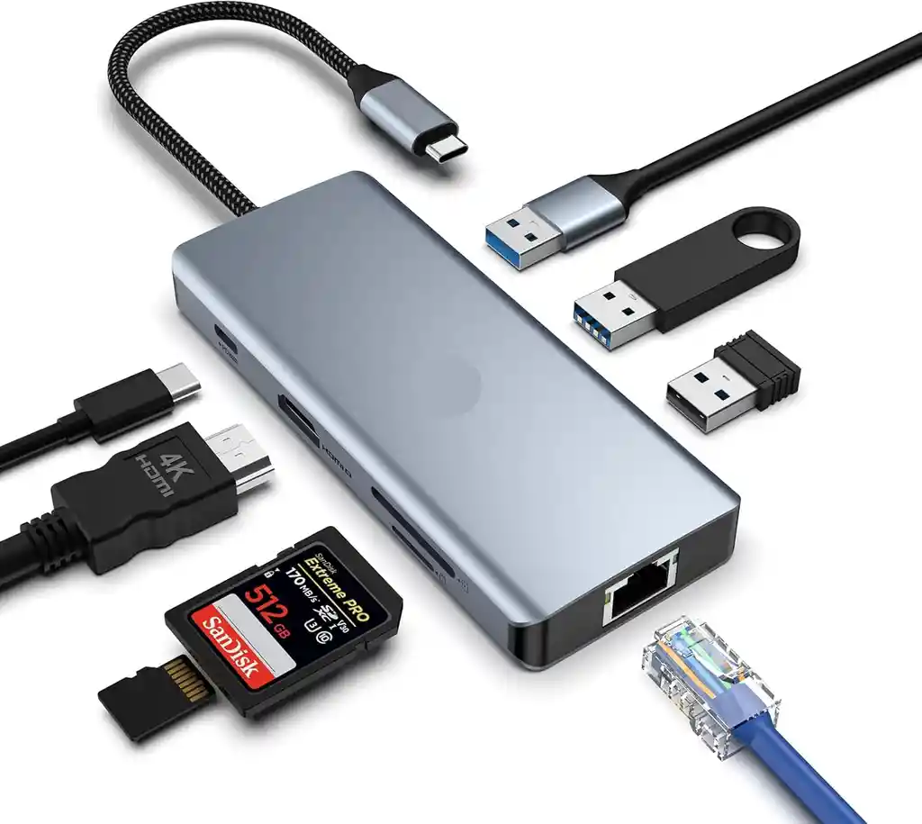 Integración y versatilidad sin costuras: integra sin problemas esta versátil base USB C 8 en 1 en tu configuración para una mayor conectividad. Proporciona 1 salida de video externa a 4K @30Hz a través de HDMI, 2 puertos USB A 3.0 para transferencia de datos sin problemas, 1 puerto USB A 2.0, lectores de tarjetas SD/TF universales, LAN gigabit y puertos de carga PD de 100 W. Actualice sin esfuerzo su laptop o tableta con una amplia gama de periféricos, gracias a su funcionalidad plug-and-play. Solución inmersiva de sincronización de video 4K: sumérgete en una experiencia visual inmersiva con esta avanzada solución de sincronización de video 4K. Conecte su dispositivo tipo C a televisores de alta definición, monitores o proyectores a través del puerto HDMI para reflejar o extender su pantalla sin esfuerzo. Disfruta de video y audio vívidos y de alta calidad, por lo que es perfecto para juegos, noches de cine, clases en línea y reuniones.