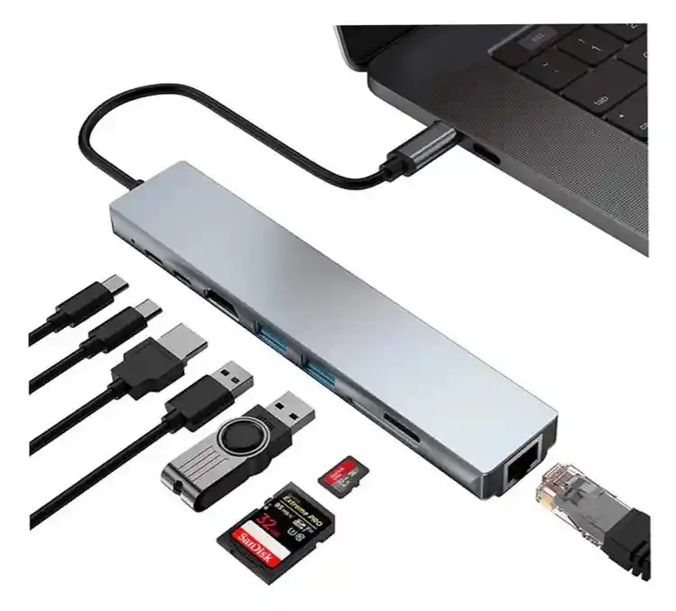 HUB USB TIPO C 8 EN 1 CON HDMI 4K + ETHERNET GIGABIT 1000 Mbps Descripción General El HUB USB Tipo C 8 en 1 es una solución completa para ampliar la conectividad de portátiles, ultrabooks y dispositivos con puerto USB-C. Permite conectar múltiples periféricos al mismo tiempo desde un solo puerto, integrando video HDMI, puertos USB de alta velocidad, conexión de red cableada y lectores de tarjetas. Su puerto Ethernet Gigabit RJ45 alcanza velocidades de hasta 1000 Mbps, proporcionando una conexión de red estable y rápida, superior a muchas conexiones WiFi. Su diseño compacto y elegante en aluminio facilita el transporte y mejora la disipación del calor durante el uso continuo. Especificaciones Técnicas Interfaz de entrada USB Tipo C macho Compatible con USB-C / USB 3.1 / Thunderbolt 3 Puertos de salida (8 en 1) HDMI 4K Ethernet RJ45 Gigabit USB 3.0 USB 3.0 USB 2.0 Lector de tarjetas SD Lector de tarjetas TF / Micro SD Puerto USB-C Power Delivery (carga) Velocidades y rendimiento HDMI: hasta 4K 3840 × 2160 a 30Hz USB 3.0: hasta 5 Gbps de transferencia Ethernet: 10 / 100 / 1000 Mbps (Gigabit) Power Delivery: hasta 100W de carga (según adaptador) Los puertos USB permiten conectar simultáneamente dispositivos como memorias, discos externos, teclado, mouse o impresoras. Compatibilidad Compatible con dispositivos con puerto USB-C que soporten transferencia de datos y video: Windows macOS Linux ChromeOS Tablets y algunos smartphones con USB-C Ejemplos de equipos compatibles: MacBook, MacBook Pro, MacBook Air, Dell XPS, Lenovo, HP, Asus, Huawei Matebook, entre otros. Beneficios Expande un solo puerto USB-C a 8 conexiones diferentes Conexión de red cableada Gigabit más estable que WiFi Permite conectar monitor externo mediante HDMI Transferencia rápida de archivos con USB 3.0 Lectura directa de tarjetas SD y MicroSD Diseño compacto y portátil en aluminio Instalación Plug & Play (no requiere drivers) Contenido del paquete 1 HUB USB Tipo C 8 en 1 Garantía del vendedor 20 días por defectos de fábrica. No aplica por golpes, humedad, sobrecargas eléctricas o mal uso. Es necesario conservar el empaque y comprobante de compra.