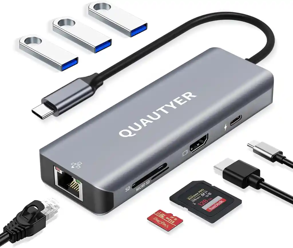AL0000002175 ADAPTADOR MULTIPUERTO USB C 8 EN 1 Convierte un solo puerto USB-C en 8 conexiones esenciales. Ideal para profesionales y estudiantes que necesitan máxima conectividad en su portátil sin usar múltiples adaptadores. Permite conectar HDMI 4K, Ethernet, USB 3.0, tarjetas SD y más desde un solo hub compacto. SALIDA HDMI 4K A 30HZ Incluye puerto HDMI con resolución hasta 4K a 30Hz, perfecto para extender o duplicar pantalla en presentaciones, trabajo multitarea o entretenimiento. Compatible con MacBook Pro, MacBook Air y otros equipos con puerto USB-C con función de video. TRANSFERENCIA RÁPIDA Y RED ESTABLE Puertos USB 3.0 con velocidad de hasta 5 Gbps para transferencias rápidas de archivos. Ranuras SD y TF ideales para fotógrafos y creadores de contenido. Puerto Ethernet Gigabit 1000 Mbps que garantiza conexión estable y rápida a internet. CARGA POWER DELIVERY 100W Puerto USB-C con carga PD hasta 100W que permite alimentar tu portátil mientras utilizas el resto de puertos. Ideal para tareas exigentes, trabajo continuo o uso prolongado sin preocuparte por la batería. DISEÑO PREMIUM Y PORTÁTIL Fabricado en aluminio resistente para mayor durabilidad y mejor disipación de calor. Diseño delgado y ligero que cabe fácilmente en cualquier bolso o mochila, perfecto para oficina, hogar o viajes. INCLUYE: 1 Hub USB C 8 en 1 Manual de usuario