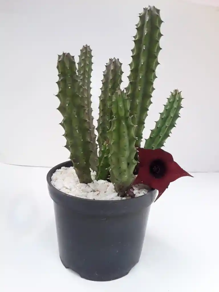 Huernia perteneciente tambien a la familia de las suculentas ,somes frecuente con la floracion de color rojo,semi sombra -Riego una vez por semana- Matera p10 negra