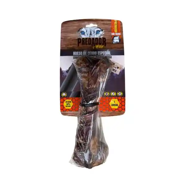 Hueso Femur/humero de cerdo, con cobertura de esófago de res, puede presentarse bañado en salsa de hígado de Res. Suplemento alimenticio para todas las razas y tamaños de Canino a partir de los 12 meses de edad, no sustituye el alimento completo de la mascota.