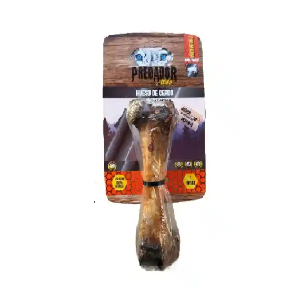 Hueso Femur/humero de cerdo, con cobertura de esófago de res, puede presentarse bañado en salsa de hígado de Res. Suplemento alimenticio para todas las razas y tamaños de Canino a partir de los 12 meses de edad, no sustituye el alimento completo de la mascota.