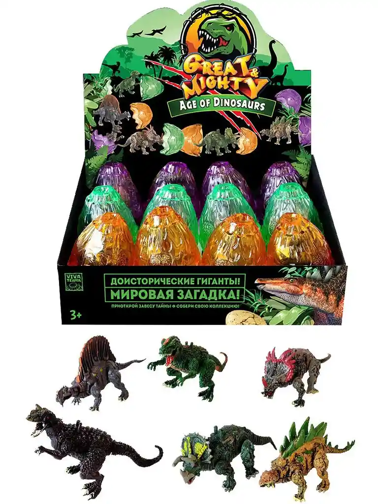 El set incluye figuras de acción de dinosaurios realistas en 3D. Las figuras vienen dentro de "huevos" o cápsulas de colores.