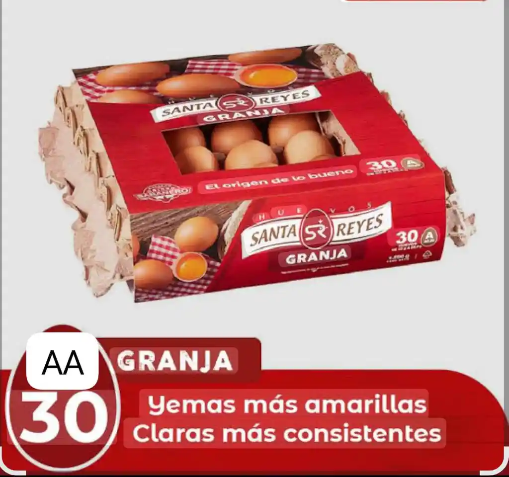 Huevo La Granja Santa Reyes: Yemas más amarillas. Claras más consistentes. Empacado, presentación de cartón AA x 30 unidades.