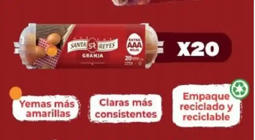 Huevo La Granja Santa Reyes: Yemas más amarillas. Claras más consistentes. Empacado reciclable, presentación AAA X 20 unidades.