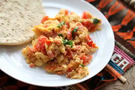 Tres Huevos batidos con Cebolla y Tomate finamente cortados. Arepa de Maiz, Pan Pequeño, Porción de Queso y Bebida Caliente.