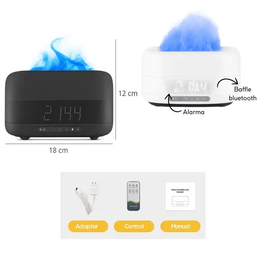 Beneficios: Difusor de aromas 3 en 1: combina humidificador, reloj digital con alarma y bafle bluetooth, creando un ambiente moderno y relajante. Perfecto para el hogar, oficina o dormitorio. Disponible en negro y blanco. Incluye adaptador de corriente, control remoto y manual de usuario. Dimensiones aproximadas: Alto: 12 cm Ancho: 18 cm Fondo: 10 cm Peso: 650 g