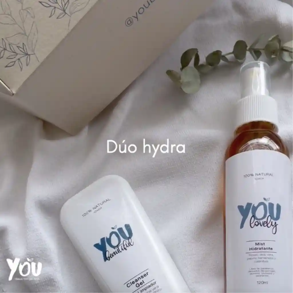 Cleanser gel + Mist hidratante Limpia profundamente e hidrata la piel y reduce la tendencia a producir grasa. El Mist hidratante YOU es un astringente con extractos naturales que brinda una acción tonificante e hidratante al rostro y reduce la tendencia a producir grasa. El Cleanser gel YOU es un jabón liquido suave con extractos naturales y ácido hialurónico, es ideal para mantener la piel limpia, hidratada y revitalizada.