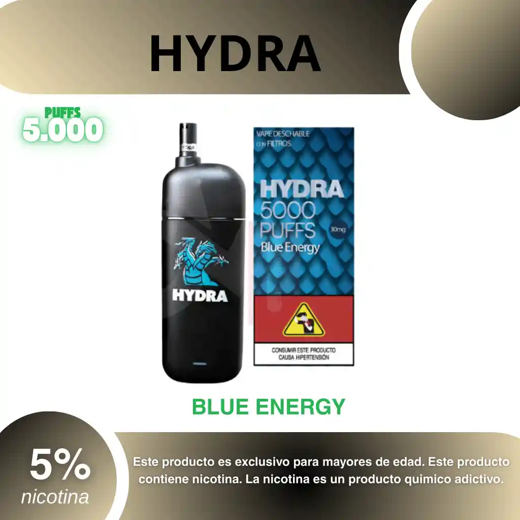 Hydra Vape 5.000 Puffs Sabor Energizante 3% PROHIBIDA LA VENTA A MENORES DE EDAD. ADVERTENCIA: ESTE PRODUCTO CONTIENE NICOTINA, LA NICOTINA ES UNA SUSTANCIA QUIMICA ADICTIVA Y NOCIVA PARA LA SALUD. Los líquidos para vapeo contienen: propilenglicol USP, glicerina USP, sabor artificial y nicotina. Este producto puede contener nicotina, una sustancia altamente adictiva que puede generar dependencia, posibles afectaciones arteriales, cardiacas, pulmonares y otras aun no identificadas. No se recomienda su uso a mujeres en embarazo, puede generar lesiones al feto. Mantener alejado de niños y mascotas. No ingerir, puede generar irritación y/o intoxicación. Por favor antes de consumir consulte a su médico posibles afectaciones o sensibilidad a alguno de sus componentes. Los componentes de este producto pueden aumentar la sensación de ansiedad En caso de notar alguna reacción adversa por favor suspenda su uso de manera inmediata. Siga las instrucciones en el envase. No alterar sus componentes. Adquiera sus productos en sitios de confianza No use productos piratas, alterados, o en los cuales no pueda comprobar su buena procedencia, Verifique la reputación del fabricante y distribuidor antes de adquirir cualquier producto Si no es usuario fumador o vapeador no se recomienda su uso bajo ninguna circunstancia Al usar este producto usted es consciente que este producto puede generar afectaciones a su salud, incluyendo aquellas que a la fecha de la compra no se han identificado y que pueden aparecer a largo plazo.