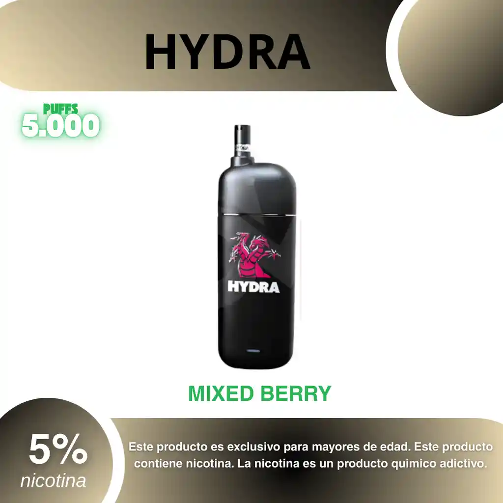 Hydra Vape 5.000 Puffs, Sabor Frutos Rojos 3% PROHIBIDA LA VENTA A MENORES DE EDAD. ADVERTENCIA: ESTE PRODUCTO CONTIENE NICOTINA, LA NICOTINA ES UNA SUSTANCIA QUIMICA ADICTIVA Y NOCIVA PARA LA SALUD. Los líquidos para vapeo contienen: propilenglicol USP, glicerina USP, sabor artificial y nicotina. Este producto puede contener nicotina, una sustancia altamente adictiva que puede generar dependencia, posibles afectaciones arteriales, cardiacas, pulmonares y otras aun no identificadas. No se recomienda su uso a mujeres en embarazo, puede generar lesiones al feto. Mantener alejado de niños y mascotas. No ingerir, puede generar irritación y/o intoxicación. Por favor antes de consumir consulte a su médico posibles afectaciones o sensibilidad a alguno de sus componentes. Los componentes de este producto pueden aumentar la sensación de ansiedad En caso de notar alguna reacción adversa por favor suspenda su uso de manera inmediata. Siga las instrucciones en el envase. No alterar sus componentes. Adquiera sus productos en sitios de confianza No use productos piratas, alterados, o en los cuales no pueda comprobar su buena procedencia, Verifique la reputación del fabricante y distribuidor antes de adquirir cualquier producto Si no es usuario fumador o vapeador no se recomienda su uso bajo ninguna circunstancia Al usar este producto usted es consciente que este producto puede generar afectaciones a su salud, incluyendo aquellas que a la fecha de la compra no se han identificado y que pueden aparecer a largo plazo.