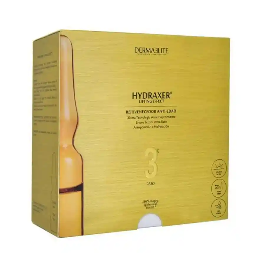 Hydraxer Lifting Effect es un tratamiento rejuvenecedor de alta eficacia con efecto tensor inmediato, diseñado para combatir los signos de la edad y mejorar la apariencia de la piel. Este potente serum en ampollas, enriquecido con Ácido Hialurónico de bajo peso molecular, proporciona hidratación profunda y un efecto lifting que atenúa las arrugas y líneas de expresión. Gracias a su sistema de entrega inteligente de activos, actúa de manera eficaz para promover la firmeza y elasticidad de la piel, a la vez que combate los efectos de la polución.