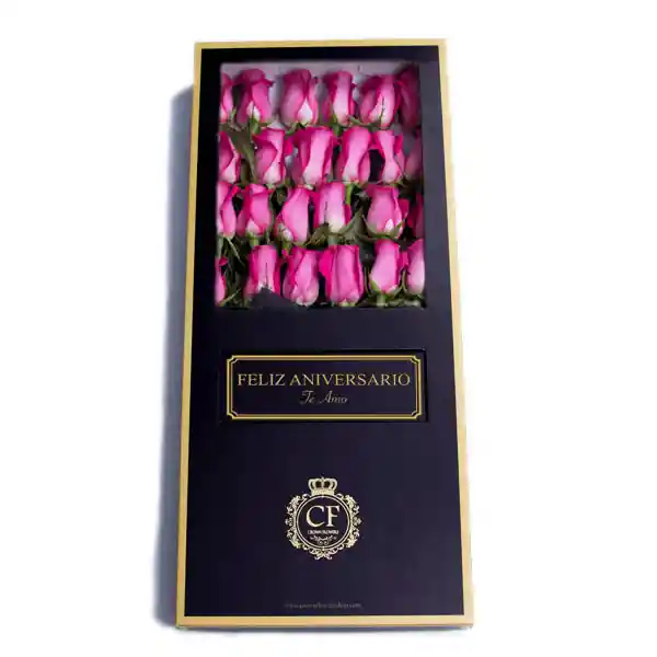 !Lujosa caja con rosas de casi un metro! Contiene 24 rosas fucsia de exportación presentadas de manera elegante en esta caja de 78cm x 34cm, ideal para causar una gran impresión. El estuche cuenta con una ventana en la tapa donde va el sticker de tu elección, y una tarjeta con sobre adentro del estuche donde va el mensaje dedicatorio.