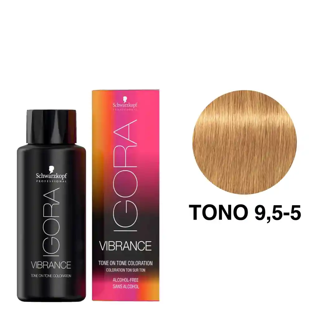 Igora Vibrance Tono 9,5-5 Tonalizador Dorado 60mL IGORA VIBRANCE es una coloración semi-permanente vanguardista que tiene una durabilidad de hasta 25 lavados. Gracias al nuevo Complejo Moisture Protecting ahora ofrece hasta un 100 % más de brillo instantáneo y una protección del cabello mejorada. Disponible en 68 tonos que complementan a la perfección con la gama de la coloración permanente IGORA ROYAL para una disponer de una gran cantidad de servicios de aplicación dual. Beneficios: Cubre de un 50% a 70% las canas. Coloración duradera. Brillo instantáneo. Modo de uso: La proporción de la mezcla debe ser 1:1 con Activador Igora Vibrance Utilizar un recipiente no metálico. Mezclar hasta conseguir una mezcla homogénea. Aplicar en la totalidad del cabello empezando desde la raíz, en cabello seco sin lavar. Tiempo de exposición: El tiempo de exposición del nuevo IGORA VIBRANCE es de hasta 20 minutos. Para aplicaciones globales en todo el cabello o en el crecimiento de la raíz recomendamos un tiempo de exposición de 10-20 minutos y de 5-20 minutos para un servicio de brillo. Nota: Leer atentamente las instrucciones al interior de la caja.