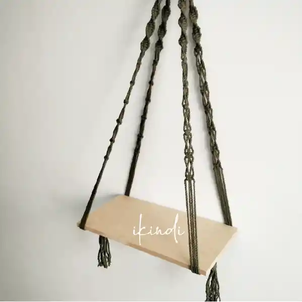 Base Para Mesa Tejida Sobre un Aro de Madera en Hilo de Algodón Color Verde Militar. Incluye Tabla de Mdf de 30 cm x 15. Puede ir Fijo en Pared o Suspendido y su Medida Total es de 30 cm de Ancho x 70 cm de Alto x 15 cm de Fondo. No Incluye Accesorios.
