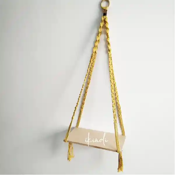 Base Para Mesa Tejida Sobre un Aro de Madera en Hilo de Algodón Color Amarillo. Incluye Tabla de Mdf de 30 cm x 15. Puede ir Fijo en Pared o Suspendido y su Medida Total es de 30 cm de Ancho x 84 cm de Alto x 15 cm de Fondo. No Incluye Accesorios.