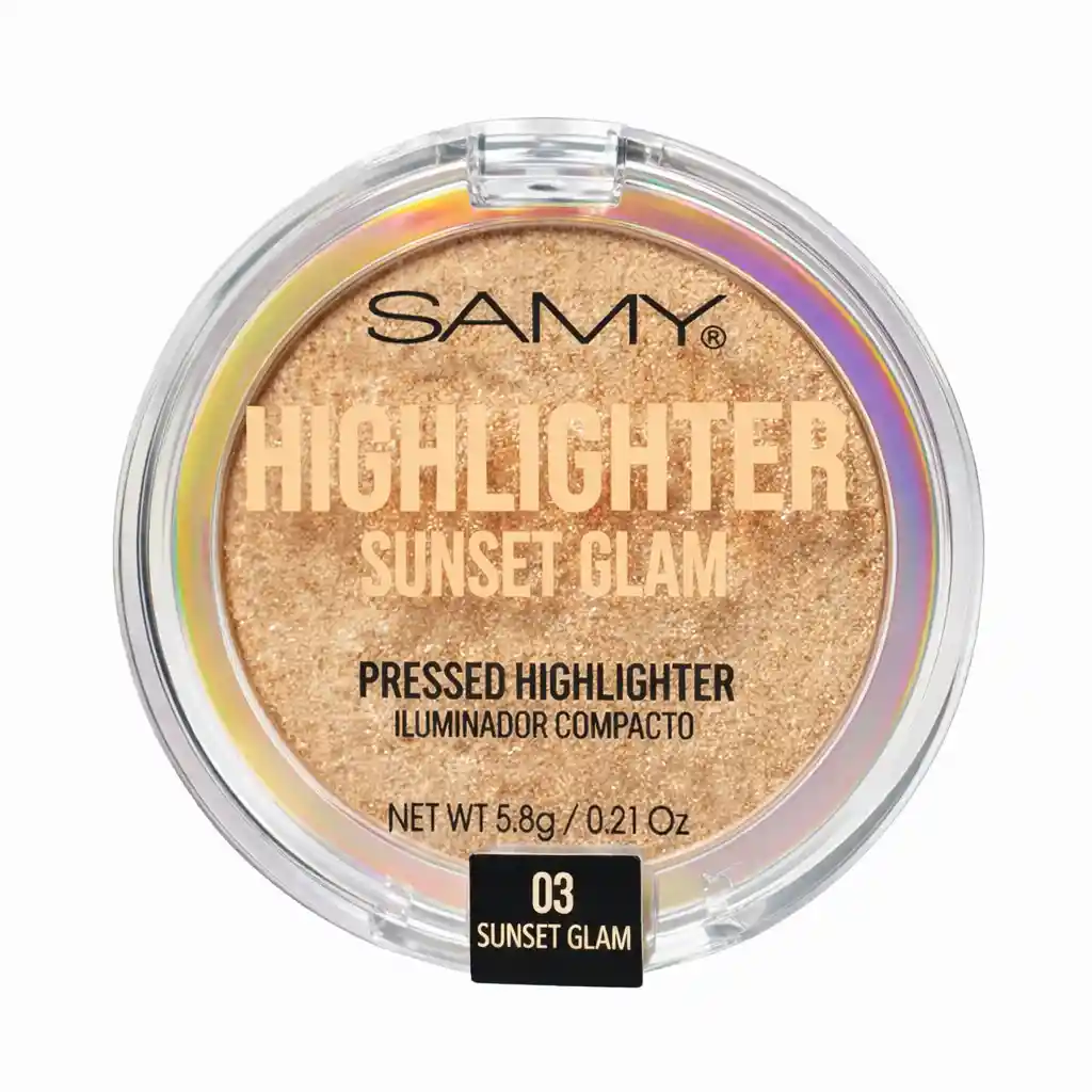 El Iluminador Compacto SAMY Sunset Glam realza el rostro con un brillo luminoso y sofisticado de tono dorado cálido, ideal para resaltar pómulos, arco de la ceja, nariz y escote.
