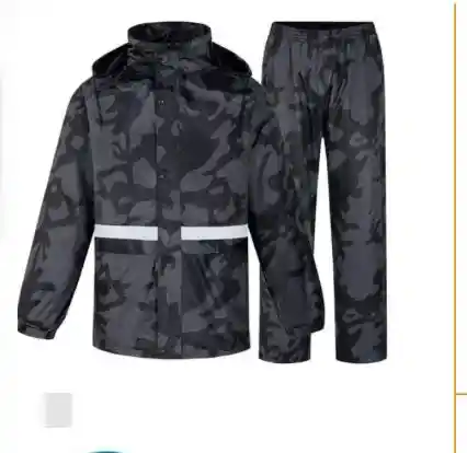 CONJUNTO IMPERMEABLE TIPO SUDADERA CAMUFLADO Ideal para usar como traje de vestimenta casual , para transportarte en tu motocicleta , o exposición al aire libre. * Conjunto impermeable de 2 piezas mas estuche * Vista reflectiva en la chaqueta para mayor visibilidad * La capota ancha te puede proteger del viento y la lluvia, la capota se puede guardar en el cuello. * Cuando la lluvia cae sobre la tela, el efecto hoja de loto se genera inmediatamente. Con un ligero movimiento del dedo, las gotas de agua pueden deslizarse y el efecto impermeable es muy bueno. * Doble cubierta con tapacremallera: el impermeable trae tapacremallera y cierre con cremallera y broche adicional para protegerte totalmente de la lluvia. * Pantalones de lluvia con forro interno y resortado en la pretina * Diseño en tela camuflada