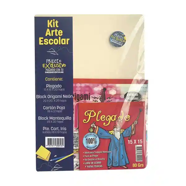 Impresionarte kit escolar redencion bono blocks. Contiene 1 plegable + 1 block origami + 1 cartón paja + 1 block mantequilla + 1 paquete cartulina iris