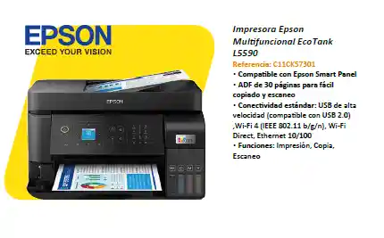 Impresora Epson Multifuncional EcoTank L5590 Referencia: C11CK57301 ▪ Compatible con Epson Smart Panel ▪ ADF de 30 páginas para fácil copiado y escaneo ▪ Conectividad estándar: USB de alta velocidad (compatible con USB 2.0) ,Wi-Fi 4 (IEEE 802.11 b/g/n), Wi-Fi Direct, Ethernet 10/100 ▪ Funciones: Impresión, Copia, Escaneo EXPOTECNOLOGIA 3505945136