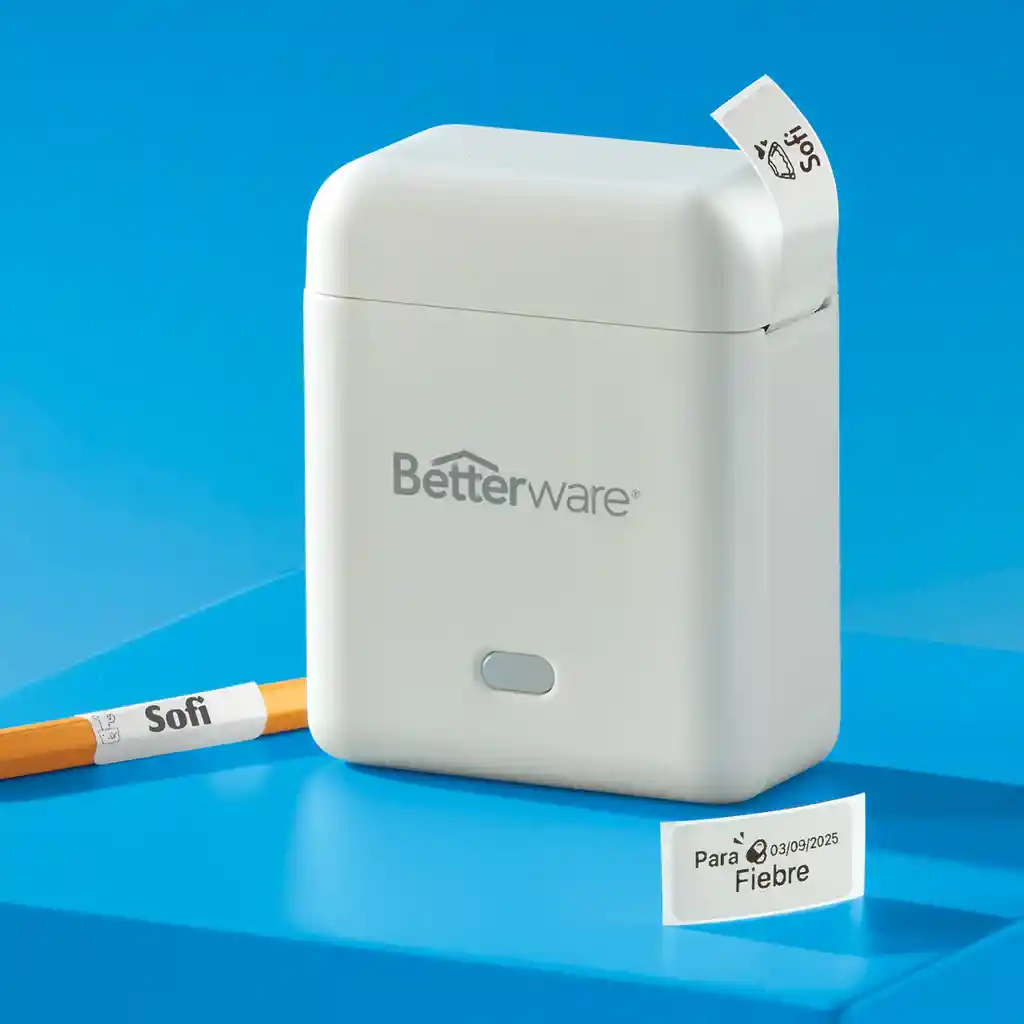 Etiqueta en segundos y sin tinta con la Impresora Identi-Express Betterware. Esta impresora térmica de tamaño compacto no requiere tinta, es recargable e incluye un rollo con 200 etiquetas tipo sticker de 3 x 1.4 cm. ¡Personaliza tus etiquetas desde la app! Utilizala para útiles escolares, contenedores, pastilleros y más.