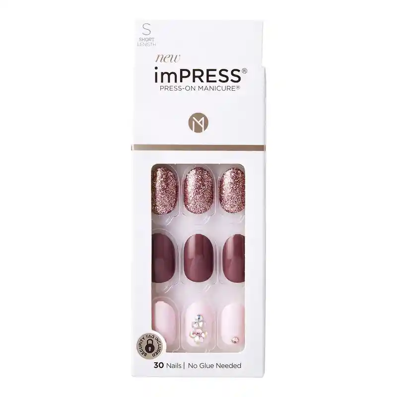 ¡La forma revolucionaria de aplicar el esmalte se mantiene a la moda con nuevos looks decorativos para uñas! Ahora 2 veces más duradera que otras uñas pre-pegadas, la manicura IMPRESS es la única uña de presión a prueba de agua con un adhesivo seguro que no dañará las uñas Sin pegamento, sin tiempo de secado Seguro en uñas naturales El brillo ultra gel nunca se opaca Pad de preparación, mini lima incluida y palito de manicura.