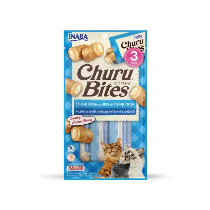 INABA Cat Snack Churu Bites – Bocados con Pollo y Relleno de Atún y Vieira 3 unidades, son deliciosos snacks para gatos elaborados forma de almohada con doble textura, comienza con una pasta de pollo suave al horno sin granos, conservantes o colores artificiales y luego un centro con el delicioso relleno Churu sabor atún y vieira. Este snack es muy fácil de administrar, simplemente rasgue un tubo y suminístrale a tu gato un bocado a la vez. Cada tubito contiene aproximadamente 10 bocados, que tu minino disfrutará al máximo con su doble textura para morder y lamer. HECHO CON INGREDIENTES SALUDABLES: Cada producto INABA está hecho de deliciosos ingredientes de alta calidad, incluyendo pollo criado en granjas y atún silvestre capturado PORCIONES ADECUADAS: Los tubos individuales, perfectamente porcionados, contienen 10 gramos de producto (aproximadamente diez bocados), lo que ayuda a mantener las golosinas frescas y deliciosas para tus gatitos. APROBADO POR GATOS QUISQUILLOSOS: Incluso el gato más quisquilloso devorará estas golosinas del tamaño de un bocado directamente de tu mano, incluso si has usado el centro cremoso para colocar una píldora en su bocadillo especial. SUAVE, SABROSO Y SALUDABLE: Con un 72% de humedad y aproximadamente 13 calorías por tubo, estas son golosinas bajas en calorías que puede sentirse bien al alimentarse. También tiene añadido vitamina E para su sistema inmunológico y extracto de té verde como antioxidante.