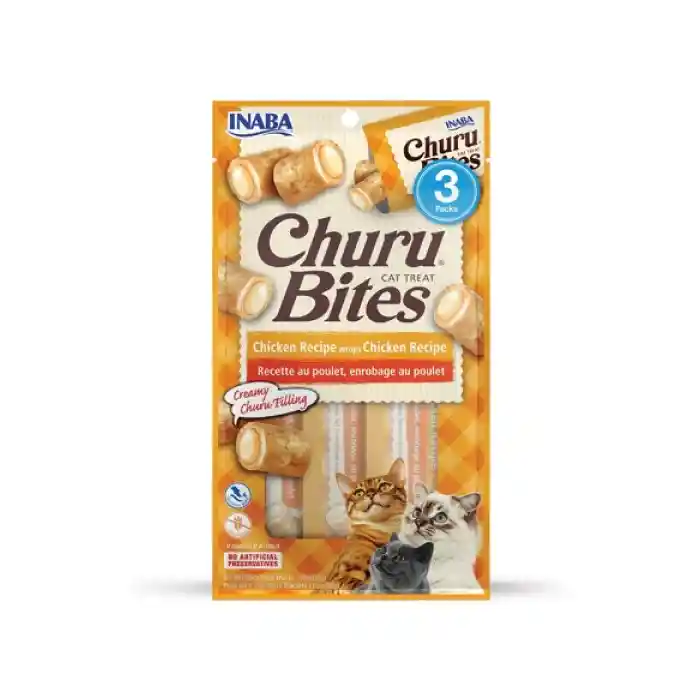 INABA Cat Snack Churu Bites – Bocados con Pollo y Relleno de Pollo 3 unidades, son deliciosos snacks para gatos elaborados forma de almohada con doble textura, comienza con una pasta de pollo suave al horno sin granos, conservantes o colores artificiales y luego un centro con el delicioso relleno Churu sabor Pollo. Este snack es muy fácil de administrar, simplemente rasgue un tubo y suminístrale a tu gato un bocado a la vez. Cada tubito contiene aproximadamente 10 bocados, que tu minino disfrutará al máximo con su doble textura para morder y lamer. HECHO CON INGREDIENTES SALUDABLES: Cada producto INABA está hecho de deliciosos ingredientes de alta calidad, incluyendo pollo criado en granjas y atún silvestre capturado PORCIONES ADECUADAS: Los tubos individuales, perfectamente porcionados, contienen 10 gramos de producto (aproximadamente diez bocados), lo que ayuda a mantener las golosinas frescas y deliciosas para tus gatitos. APROBADO POR GATOS QUISQUILLOSOS: Incluso el gato más quisquilloso devorará estas golosinas del tamaño de un bocado directamente de tu mano, incluso si has usado el centro cremoso para colocar una píldora en su bocadillo especial. SUAVE, SABROSO Y SALUDABLE: Con un 72% de humedad y aproximadamente 13 calorías por tubo, estas son golosinas bajas en calorías que puede sentirse bien al alimentarse. También tiene añadido vitamina E para su sistema inmunológico y extracto de té verde como antioxidante.