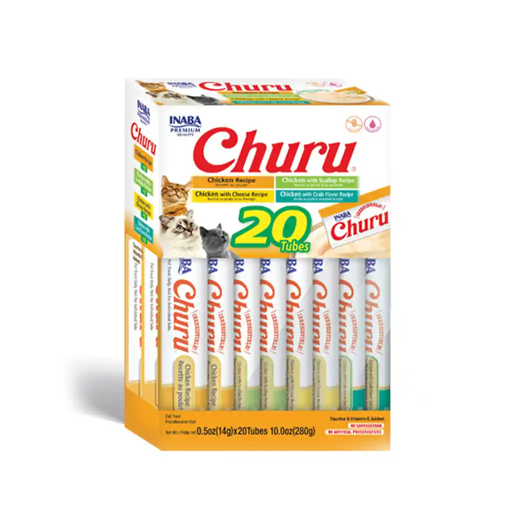 5 Tubos de Pollo 5 Tubos de Pollo y Cangrejo 5 Tubos de Pollo y Viera 5 Tubos de Pollo y Queso HECHO CON INGREDIENTES EN LOS QUE PUEDES CONFIAR: Cada producto Inaba está hecho con deliciosos ingredientes de alta calidad, incluyendo pollo de granja y/o atún natural capturado en libertad MANTENGA A SU FELINO HIDRATADO SIN AÑADIR CALORÍAS: Cada delicioso y cremoso tubo de Churu contiene un 91% de humedad y sólo seis calorías (una décima parte de las calorías de las golosinas secas tradicionales para gatos), lo que lo convierte en un snack saludable con el que puedes sentirte bien alimentándolo LIBRE DE COSAS MALAS: Su amigo felino es importante para nosotros, por eso hemos eliminado de nuestras golosinas para gatos los cereales, los conservantes, los colorantes artificiales y la carragenina, pero hemos añadido elementos como la taurina para ayudar a su salud en general. HÁGALOS COMER DE SU MANO: Estos tubos de puré de carne lamibles para gatos fueron diseñados para ser alimentados con la mano como una forma interactiva de pasar tiempo con su felino, pero puede utilizarlos como un complemento de comida húmeda/seca para gatos o como una forma de disimular la medicación.¡Estos sabrosos snacks para gatos se hacen con Pollo criado en Granjas los Churu® Purés tienen el alto contenido de humedad necesario para la salud de los felinos. Simplemente rasgue un tubo y apriételo un poco para alimentar a mano a su felino con estos snacks sin cereales ni conservantes. También puede verterlo en un plato o añadirlo por encima de alimentos húmedos o secos.