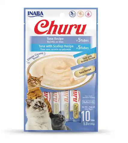 INABA Cat Snack Churu Variedad atún 10 unidades, son deliciosos snacks para gatos con textura cremosa, elaborados con atún, contiene un alto grado de humedad necesario para la salud de los felinos. Sin cereales ni conservantes. Textura cremosa y sabores sabrosos que encantan a los gatos. Ideales para tomar junto con medicamentos. Bajo en calorías. Diseñados para dar de comer fácilmente. Cada paquete contiene 5 Tubos de Churu sabor a atún y 5 Tubos de Churu sabor a atún y Vieira.