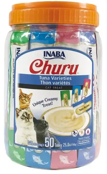 Los premios Inaba Churu son un snack cremoso y delicioso especialmente diseñado para gatos. Esta presentación en bombonera con 50 piezas ofrece una variedad de sabores a base de atún, ideal para consentir a tu mascota con una golosina saludable y nutritiva. Textura cremosa y suave que encanta a los gatos. Bajo en calorías y sin granos, lo que ayuda a mantener un peso saludable. Enriquecido con vitamina E y extracto de té verde, que favorecen la salud y el bienestar. Ideal para usar como premio, complemento de alimento seco o para facilitar la administración de medicinas. Presentación práctica en sobres individuales que garantizan frescura en cada porción Contenido: 50 sobres (14 g c/u) – Peso total neto: 700 g Variedad de sabores: Atún con combinaciones irresistibles que mantienen a tu gato interesado.