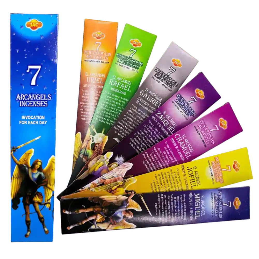 Incienso de los 7 arcángeles es una combinación de distintas flores, maderas y cortezas que representan a cada arcángel que bendecirá tu hogar o negocio cada día de la semana. Aroma que representa cada arcángel: Arcángel Miguel: Ruda Arcángel Jofiel: Mil Flores Arcángel Chamuel: Rosa y Miel Arcángel Gabriel: Sándalo Arcángel Rafael: Jazmín Arcángel Uriel: Canela Arcángel Zadquiel: Violeta • El Arcángel Miguel: Príncipe de la Presencia. Yo Soy, Miguel quien te protege y guía el día Domingo, acudo a ayudarte con la Energía del Amor Divino, cortando ataduras discordantes y te libero del dolor y el sufrimiento de problemas y dificultades así como de pensamientos agobiantes. • El Arcángel Jofiel: Príncipe de la Iluminación. Yo Soy, Jofiel quien te protege y guía el día Lunes, con la Llama de la Sabiduría y Entendimiento, hago comprender la realidad substancial e ilimitada de la Divinidad y te ayudo a que tus anhelos, ideas y proyectos se concreten. • El Arcángel Chamuel: Príncipe de la Adoración. Yo Soy, Chamuel quien te protege y guía el día Martes, sin la fuerza del Amor nada existe en el Universo, y te ayudo a contemplar la luz del Amor en la conciencia cotidiana que te libera y perfecciona física y espiritualmente. • El Arcángel Gabriel: Príncipe Comunicador Celestial de la Palabra Divina. Yo Soy, Gabriel quien te protege y guía el día Miércoles, afino tu discernimiento e intuición, te muestro el sendero correcto para el cumplimiento de tu misión en este mundo, purifico tus electrones y te ayudo a ascender en un marco de pureza y fidelidad tu verdad individual. • El Arcángel Rafael: Príncipe SAnador Divino. Yo Soy, Rafael quien te protege y guía el día Jueves, con la Llama de la Consagración curo tu cuerpo, mente y alma. Alivio tus sufrimientos y te guió hacia la máxima salud y bienestar cuya clave se encuentra en tu divinidad interior. • El Arcángel Uriel: Príncipe de la Luz del Conocimiento. Yo Soy, Uriel quien te protege y guía el día Viernes, mediante la Llama del Conocimiento, revelo amorosamente la Luz del Creador disolviendo la oscuridad, las sombras. Otorgando siempre el amparo y la provisión espiritual y material requeridas. • El Arcángel Zadquiel: Príncipe de la Transmutación. Yo Soy, Zadquiel quien te protege y guía el día Sábado, con el poder de la Llama Violeta, te ayudo a limpiar y regenerar tu cuerpo físico y a borrar toda huella de traumas, tristeza, fracasos, infelicidad de tu mente y de tu corazón.