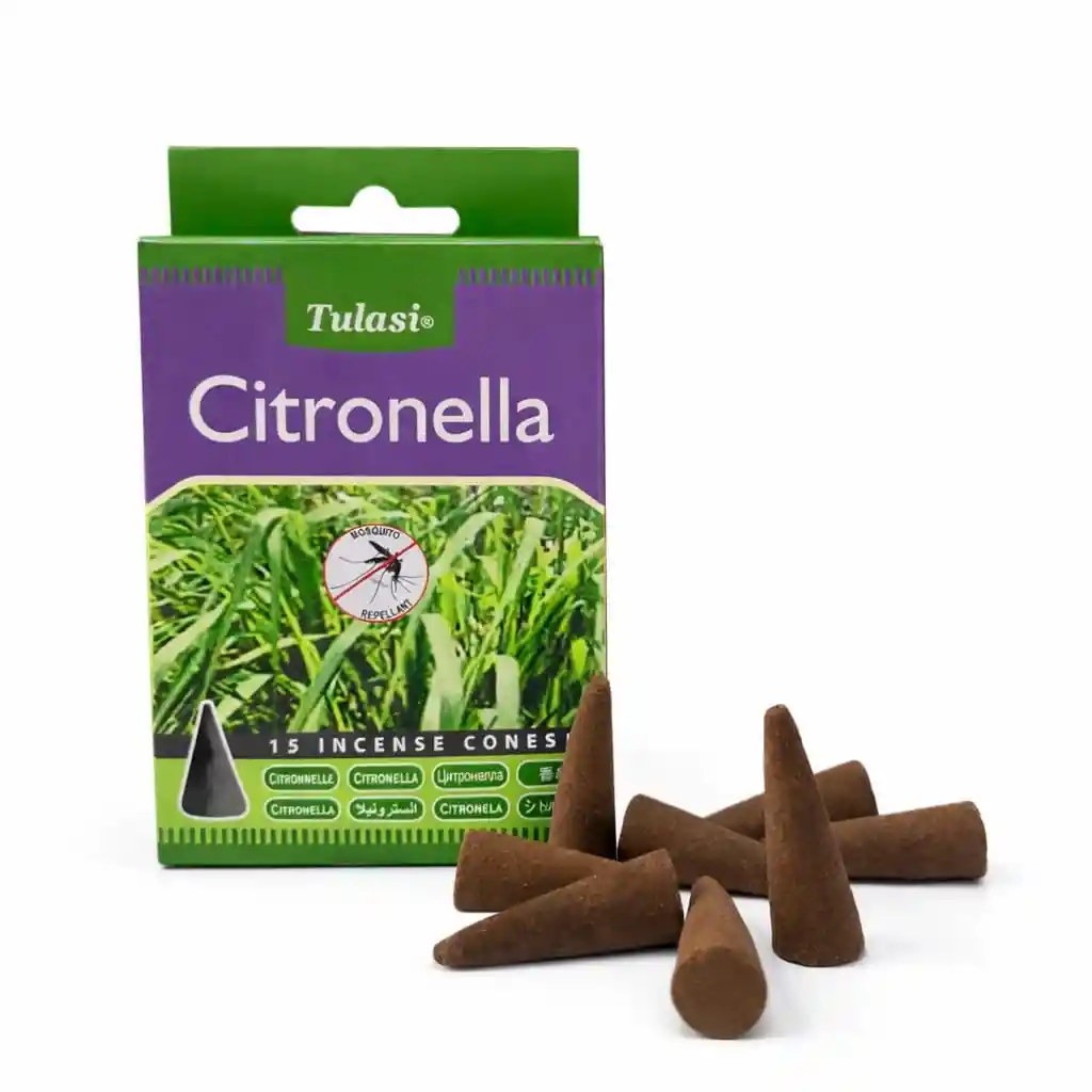 Conos de incienso con aroma fresco y cítrico de citronella, ideales para aromatizar espacios y ayudar a repeler mosquitos de forma natural, creando un ambiente agradable y refrescante. Perfectos para usar en interiores o exteriores. Modo de uso: encender la punta del cono, apagar la llama y colocarlo sobre un porta incienso resistente al calor. Contenido: 15 conos.