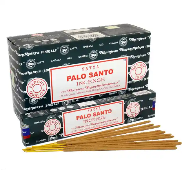 INCIENSO NAG CHAMPA SATYA PALO SANTO DE LA INDIA. Caja de 15g. Descripción: Incienso original Satya Sai Baba aroma PALO SANTO Caja de 15 gramos que contiene entre 8 a 15 varitas dependiendo del peso de las mismas. Tiempo de quemado: 45 minutos aproximadamente. El incienso de Palo Santo es una madera sagrada sudamericana utilizada para limpiar energías negativas, purificar ambientes y promover la relajación gracias a su aroma dulce, cítrico y amaderado. Muy usado en meditación, yoga y aromaterapia, el humo de sus varillas o trozos naturales aporta calma, reduce el estrés y equilibra emocionalmente.