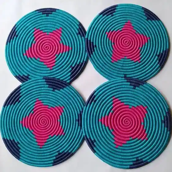 Individual o Porta caliente 30cm ,Técnica Cestería en Rollo hecho en Fique y Paja Este producto artesanal es elaborado en la Técnica Cestería en Rollo hecho totalmente a mano en un tejido Delgado y liviano dando forma a una espiral que lleva el alma de paja cubierta con fique de alegres colores, donde todos los artesanos de Guacamayas Boyacá herederos de la tradición tejedora Laches los fabricamos. Dimensiones : 30cm Diámetro Colores: Se ofrecen individuales surtidos en diferentes combinaciones o también pueden ser por juegos de 6 iguales.