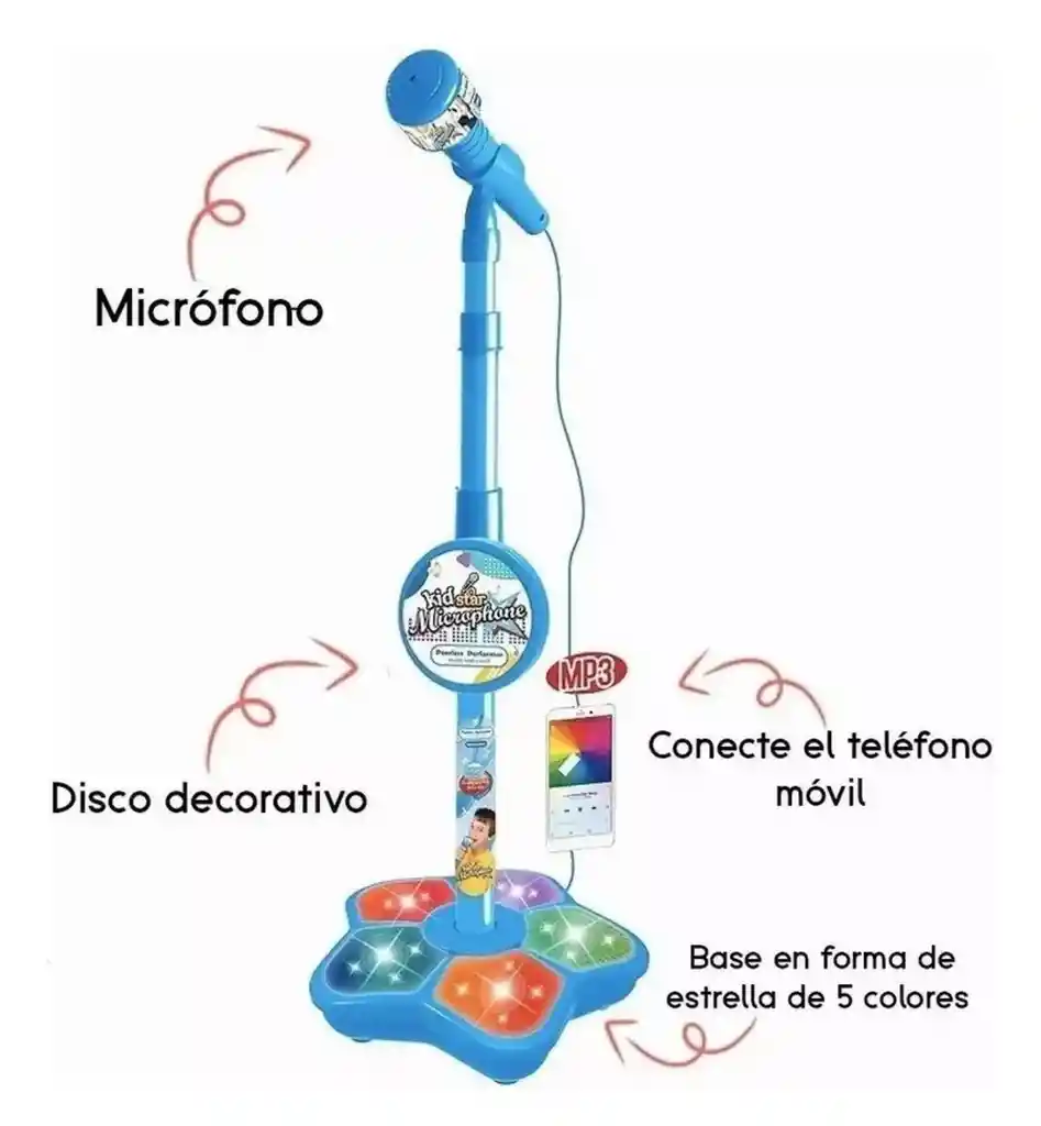 Micrófono para cantar con luz integrada para ambientar el momento. Los niños pasaran horas de diversión Altura máxima ajustable de 88cm Incluye cable auxiliar 3.5mm Funciona con 3 baterías AA (no incluidas). Disponible solo AZUL