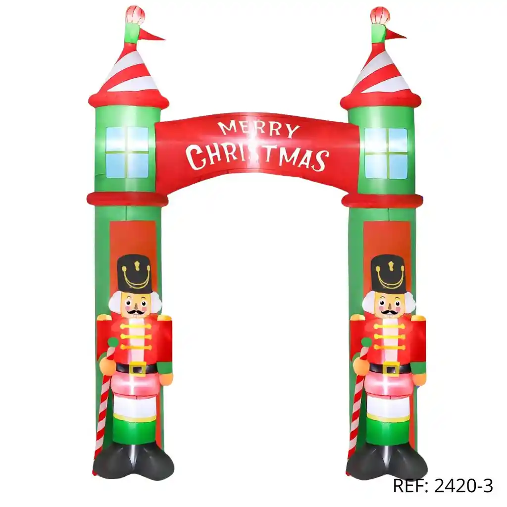 Arco inflable navideño de 12 pies con dos soldados y castillo, ideal para decorar patios o entradas. Incluye luces LED blancas, soplador autoinflable, estacas, cuerdas y sacos de arena para instalación segura. Se infla en 60 segundos y es perfecto para eventos, fiestas y decoraciones exteriores durante la temporada navideña.