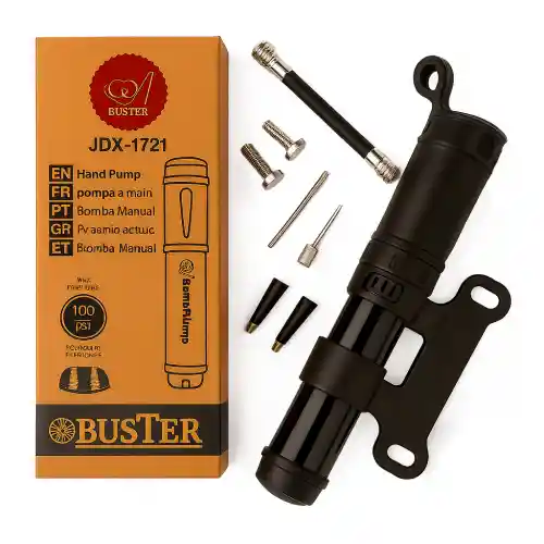 mini bomba manual portátil diseñada principalmente para bicicletas y balones. Especificaciones Técnicas Presión Máxima: Soporta hasta 100 PSI (libras por pulgada cuadrada). Material: Construcción en aleación de aluminio de alta calidad, lo que lo hace duradero y ligero. Peso Aproximado: Alrededor de 86 g a 120 g según la configuración del kit. Compatibilidad de Válvulas: Incluye adaptadores para válvulas Schrader (auto) y Presta (bicicleta de ruta), además de boquillas para inflables.