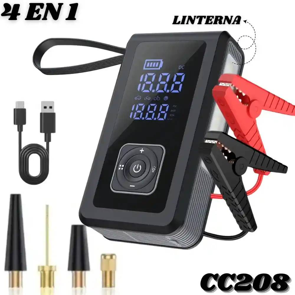 Inflador De Llantas Compresor Portatil Para Carro Moto Bicicleta Balones Bateria Repuesto De Emergencia Iniciador Auto 4 En 1 Olvídate de quedarte varado por una batería muerta en medio de la nada o buscar una estación de servicio con una llanta baja. El Dispositivo de Emergencia 4 en 1 es la herramienta definitiva de seguridad vial que combina potencia y portabilidad. Diseñado para conductores precavidos, ciclistas y aventureros, este equipo compacto cabe en tu guantera o baúl. Funciones 4 En 1: 1. Iniciador de Batería: Revive tu auto en segundos: Si tu batería muere por el frío o por dejar las luces encendidas, Conecta las pinzas inteligentes, enciende el dispositivo y arranca tu motor al instante. - Compatibilidad: Ideal para automóviles a gasolina y Diesel (hasta cierto cilindraje). 2. Compresor de Aire (Inflador de Llantas): Cuenta con una pantalla digital LCD donde puedes preestablecer la presión deseada (PSI, BAR, KPA). El inflador se detiene automáticamente al llegar a la presión indicada, evitando el sobre-inflado. - Multiuso: Incluye boquillas adicionales para inflar llantas de carro, moto, bicicleta, balones deportivos y mucho más. Presión máxima de hasta 150 PSI. 3. Power Bank: Energía Móvil: No te quedes incomunicado. Gracias a su puerto USB de salida, funciona como una batería externa para cargar tu celular, tablet, cámara o GPS mientras estás de viaje o campamento. 4. Linterna LED de Emergencia: - Iluminación Nocturna: Potente luz LED para revisar el motor en la oscuridad o cambiar una llanta de noche. - Modo SOS: Funciones de luz intermitente para señalar tu posición y pedir ayuda en caso de accidente en la carretera. Especificaciones: - Funciones: Inflador, Arrancador, Power Bank, Linterna. - Pantalla: Digital LCD. - Unidades de presión: PSI, BAR, KPA. Paquete Incluye: 1x Unidad Principal 4 en 1. 1x Juego de Pinzas Inteligentes (Clamps) para batería. 1x Manguera de aire flexible. 1x Set de boquillas (aguja para balones, boquillas plásticas). 1x Cable de carga USB. 1x Manual de usuario.