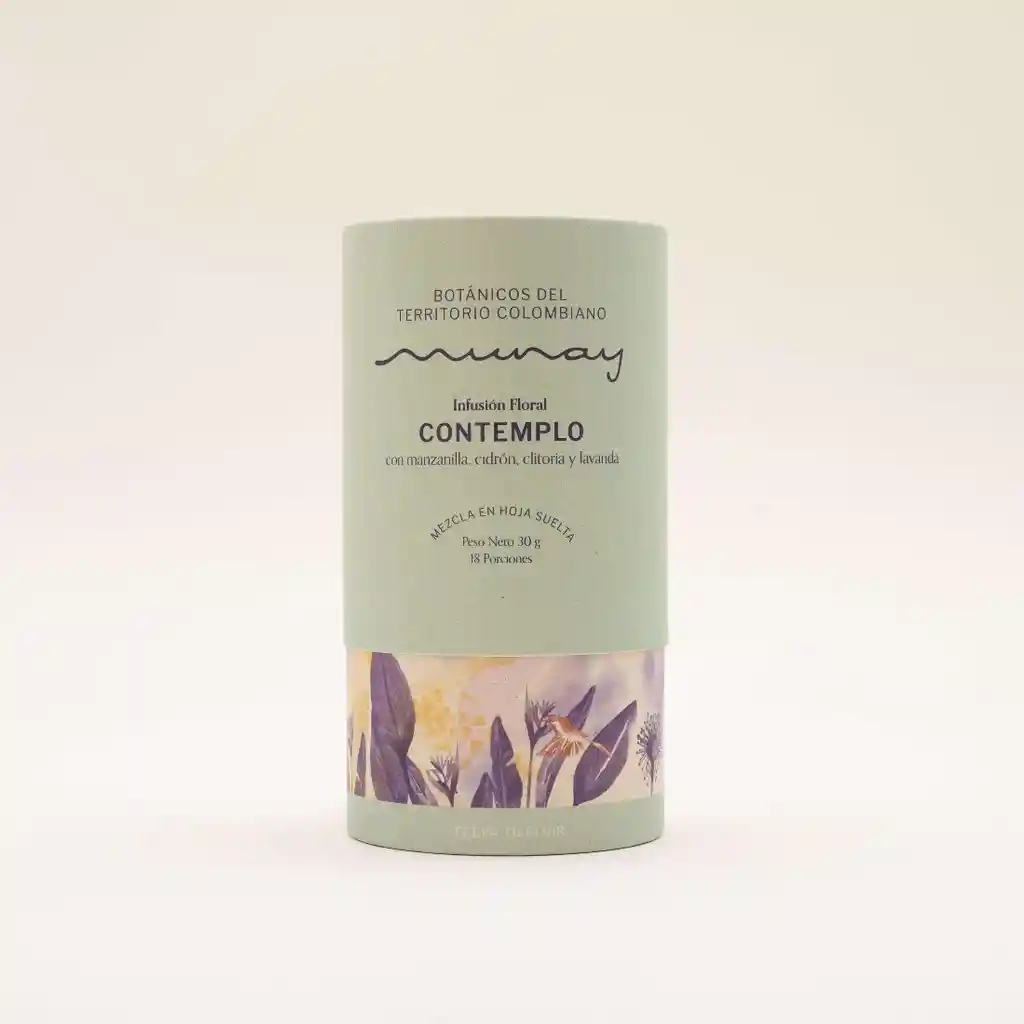 La Infusión floral Contemplo de Munay es una mezcla diseñada pensando en relajar y en el descanso profundo con una mezcla de plantas tradicionalmente relajantes y nervines que alivian estados de estrés y ansiedad. El tono azul del licor da a esta mezcla una sensación mística, misteriosa, mágica. Funcionalidad: Mezcla relajante que ayuda a conciliar el sueño mejora el estado anímico y favorece con la digestión Tipo de mezcla: Floral ¿Cuando tomarlo?: Se puede tomara a cualquier hora del día, tanto en infusión fría como caliente Modo de preparación: 1 cucharada para una taza de agua a 90 º dejar infusionar por 5 minutos filtrar, servir y endulzar al gusto Ingredientes: limonaria, cidrón, clitorea, manzanilla , lavanda y pasiflora Contenido: 30 gramos equivalente a 18 porciones Presentación: Hoja suelta
