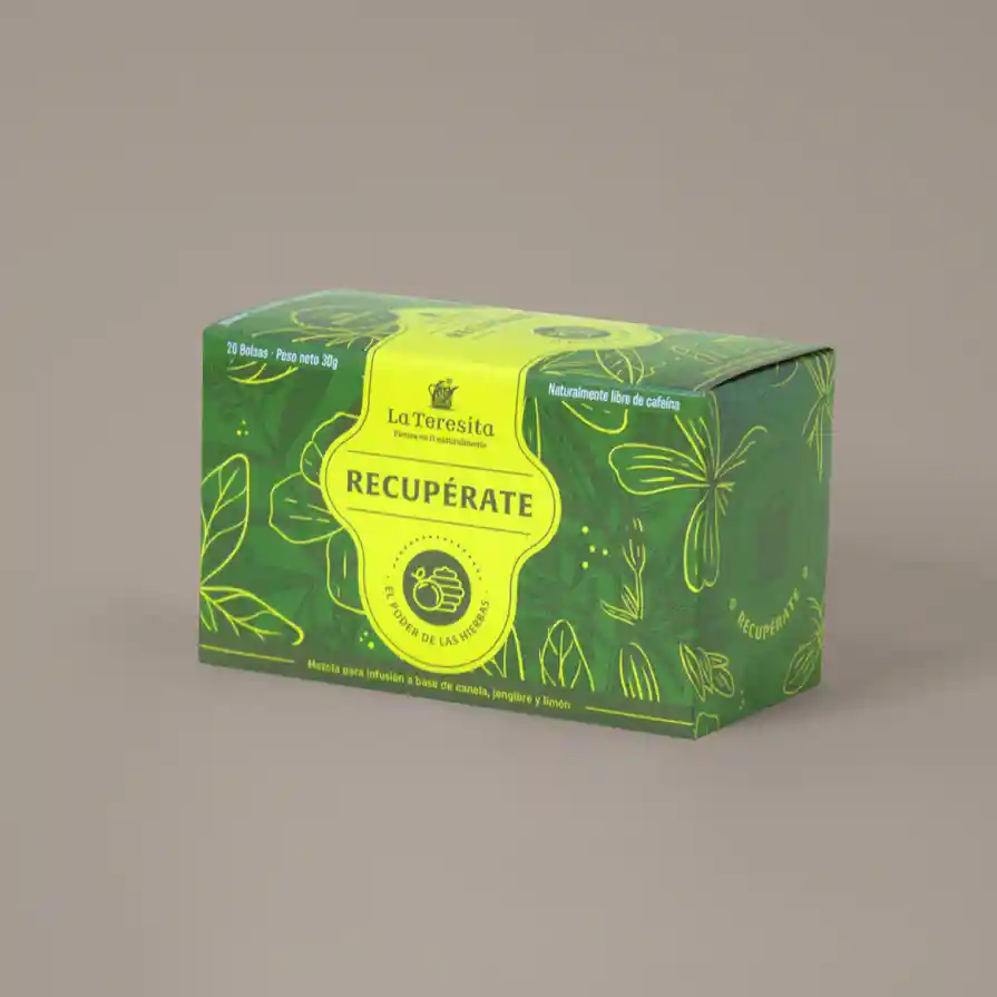 Recupérate es ideal para acompañar los estados gripales y para calentar tu cuerpo de forma natural. Prepara una tacita de infusión cuando sientas que la gripa te visita o cuando desees descansar mejor. ¡Las propiedades de esta poderosa combinación calentarán tu cuerpo y tu ser! Todos nuestros ingredientes son 100% naturales, elegimos las mejores partes de cada planta para llevar un producto hecho con calidad y amor. En cada presentación de Infusión Recupérate encuentras: - Jengibre - Miel - Canela - Limoncillo - Sabores naturales a miel y limón *Cada caja trae un total de 20 bolsitas en sobres individuales.