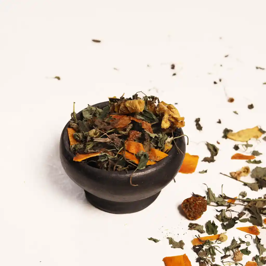 Infusiòn de moringa, piel de limon, piel de naranja, canela, manzanilla y calendula. Añade 1 cucharadita de la mezcla ern 200ml de agua caliente y deja infusionar por 5 minutos. Promueve la relajaciòn, ayuda a calmar el cuerpo y facilita un buen descanso