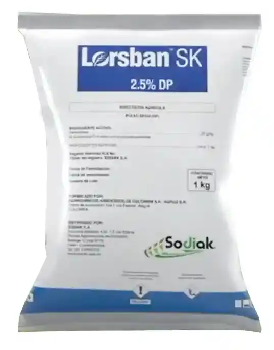 Información LORSBAN SK 2.5 % DP es un insecticida perteneciente al grupo de los organofosforados recomendado para controlar plagas masticadoras, chupadoras y perforadoras en diferentes cultivos. Es un producto no sistémico, con acción de contacto y estomacal. Tiene efecto sobre la transmisión nerviosa, mediante la inhibición irreversible de la acetilcolinesterasa. El efecto es inmediato ya que tiene un efecto de volteo rápido. Posee buena persistencia, efecto de choque y acción en profundidad. Se caracteriza por su rápido efecto inicial, notable acción penetrante y persistencia de 2-3 semanas. Frecuencia y época de aplicación: El daño por hormiga arriera (Atta cephalotes) depende del nivel de infestación y el estado fenológico del cultivo. Se recomienda aplicar preferiblemente, cuando las plantas presenten los primeros síntomas de ataque por la plaga.