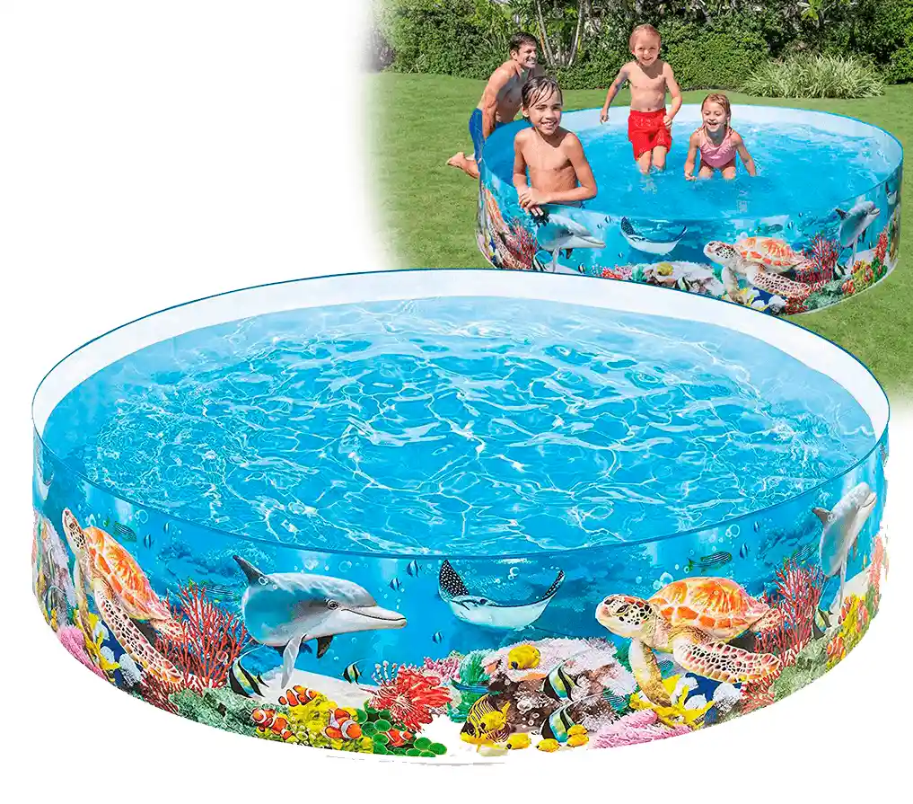 Hecho de vinilo de alta calidad, estable, confiable y seguro. Antes de la instalación, seleccione una superficie densa y uniforme, sin partes afiladas u otros objetos. La piscina no necesita preparación, no necesita inflarse.• Piscina Intex diseño de océano.• Medidas: 244cm de diámetro * 46cm de alto.• Vinilo resistente de alta duración.• Capacidad de 2040 L.• Paredes laterales seguras y resistentes.• Ideal para utilizar en el interior y exterior de la casa.• Fácil de armar y transportar.