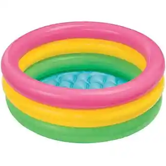 Piscina hinchable Intex infantilMedidas: 86x25 cm y 68 litros de capacidad de aguaFabricada de vinilo. tiene 3 aros de diferente color cada uno: rosa. amarillo y azulEl suelo de la piscina Intex es hinchable para mayor comodidad del niño. incluye kit de parchesLa piscina está diseñada para que sea utilizada por bebés entre 1 a 3 años de edad