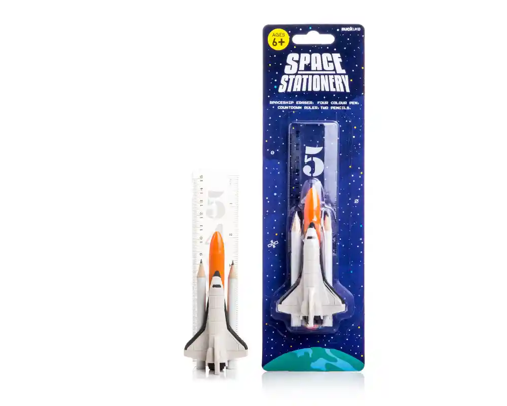 Gran Kit Para Volar al Espacio. Contiene Borrador en Forma de Cohete, 2 Lápices, 1 Esfero Con 4 Colores y Una Regla de 15 cm. Medidas. 5.1 x 16.2 x 4.4 cm.