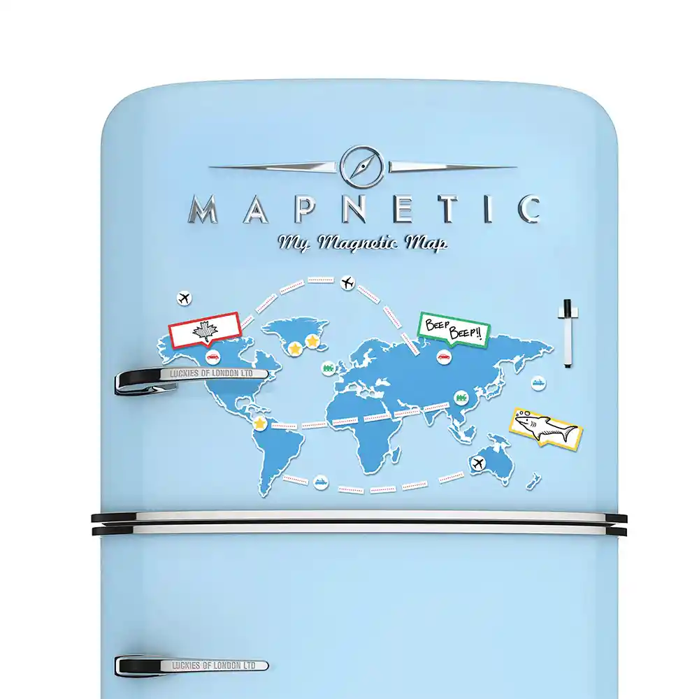 Mapnetic es un Conjunto de Mapas Magnéticos Que le Permite Documentar Los Viajes y Rutas de Sus Viajes. Viene Con Marcador Borrable y Figuras Magnéticas Barco, Avión